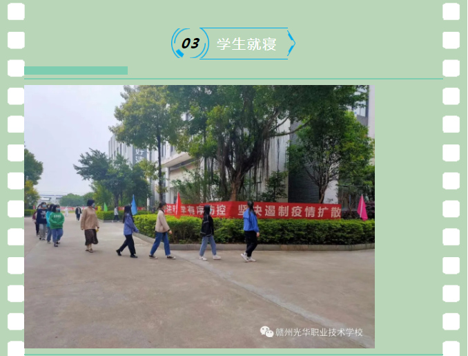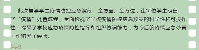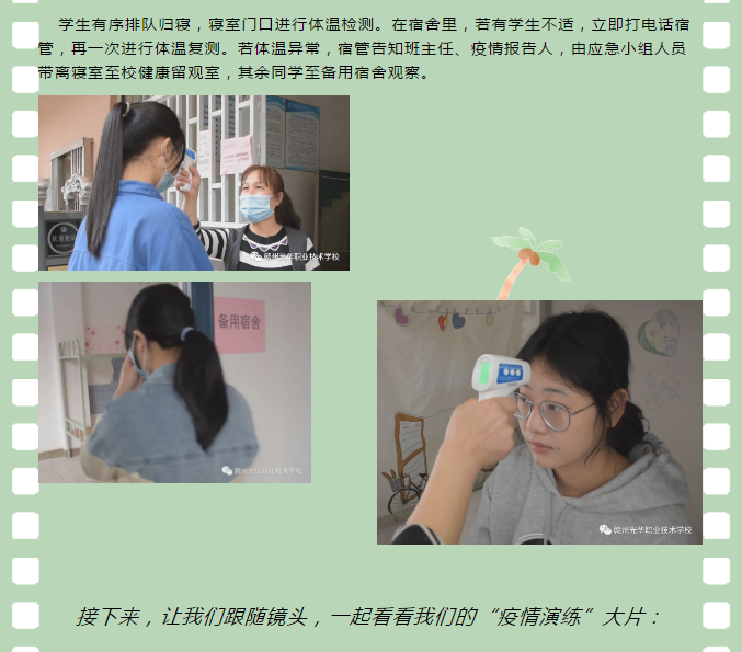 首页»校园新闻 【疫情防控进行时】|“疫”不容“迟” 赣州光华职业技术学校百名学子“疫”无反顾,“疫情演练”大片震撼“上映” 捉矢于未发,防患于未然。 发布日期:2020-05-28 浏览次数:13 4月10日上午8:30,赣州光华职业技术学校组织了17级三校生高考班返校学生疫情防控应急演练。让我们跟随小编,走进片场,与同学们一起“疫”无反顾,面对疫情,临危不惧,“疫”不容“迟”。